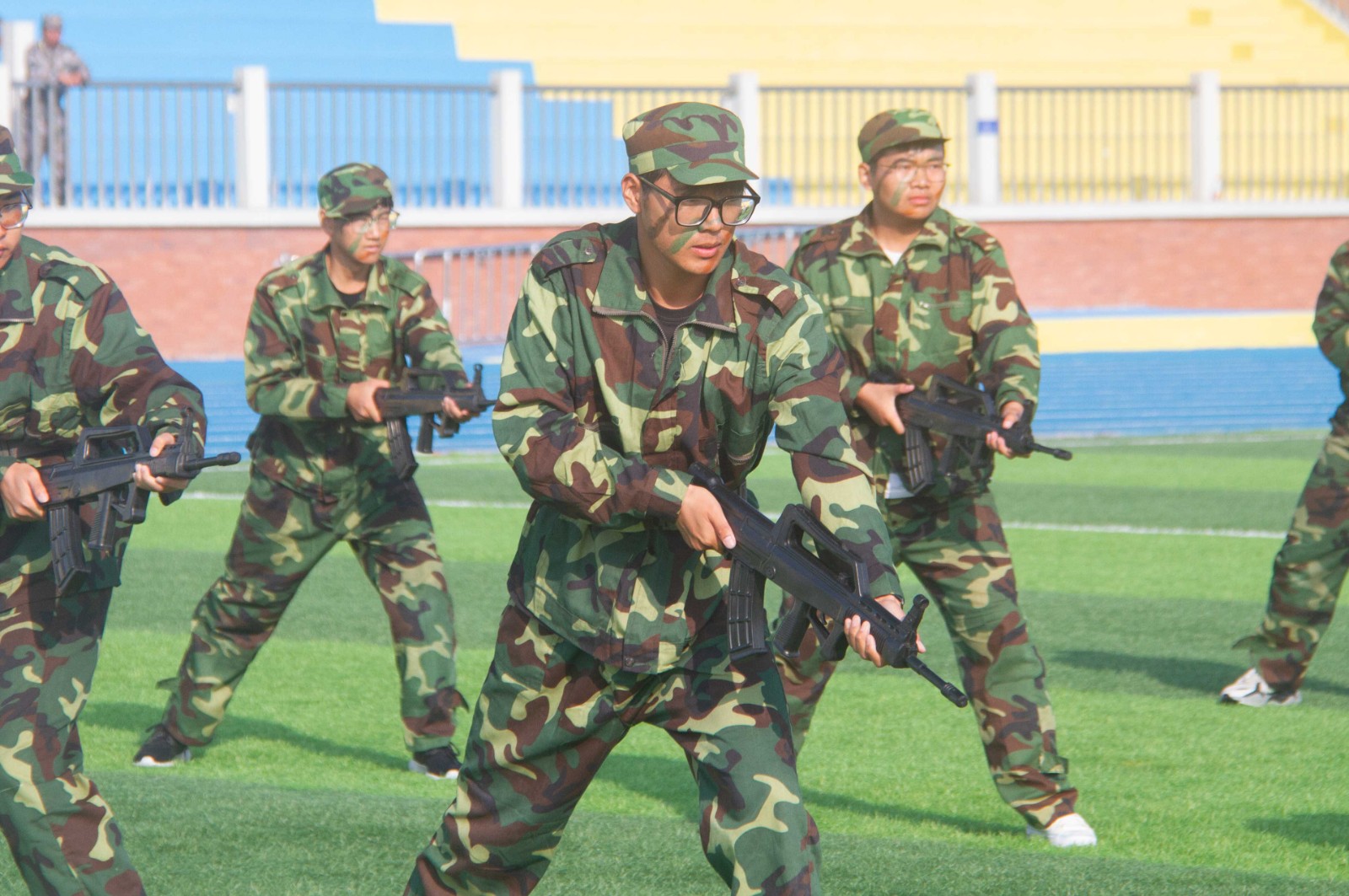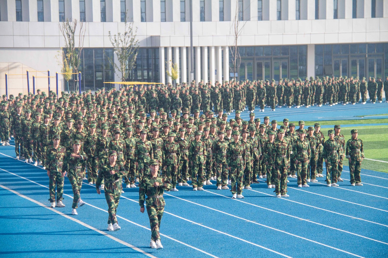 在嘹亮的军乐曲声中,身着迷彩服的2021级新生正步进入会场,整齐的步伐、宏亮的口号、严整的军姿,展现了新生们饱满的精神状态。军训汇报表演现场,方阵变换展示中,同学们统一节奏听号令,各军训连队迈着青春的步伐,踏着时代的节拍整齐入场;他们训练有素齐动身手握刺刀,拳峰向上,刺杀操方阵同学们英姿飒爽,肆意挥洒汗水;鼓点阵阵,军体拳方阵同学们踢、打、拿、拧,挺拔的身躯配合连贯的动作,一招一式,动作精炼,响亮的口号回荡在操场上空。