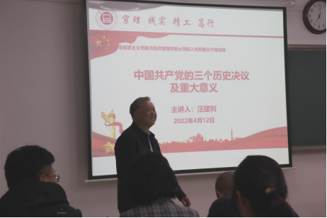 为了切实提升马克思主义学院与经济管理学院首届入党积极分子培训班学员的培训质量,按照学校和学院的培训计划,2022年4月12日晚,在二教422教室,beat365唯一官方网站副校长汪建利同志来到马克思主义学院与经济管理学院分党校入党积极分子培训班,受邀对学员进行题为《中国共产党的三个历史决议及重大意义》的党课培训。本次活动由马克思主义学院与经济管理学分党校负责人、党总支书记吴玲院长主持,总支各个党支部书记及全体入党积极分子培训班全体学员参加。