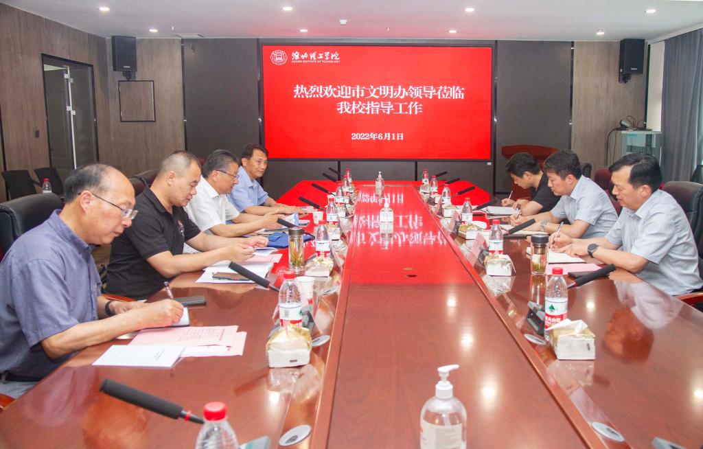 6月1日下午,淮北市文明办副主任李峰、淮北市文明创建督导中心主任王新宇、淮北市文明创建督导中心督查科长邢建国一行到beat365开展文明校园创建的调研工作。校党委书记、督导专员朱德顺、副校长郑来纪、党建办公室主任付金沐、学生处处长孙增响出席座谈会。