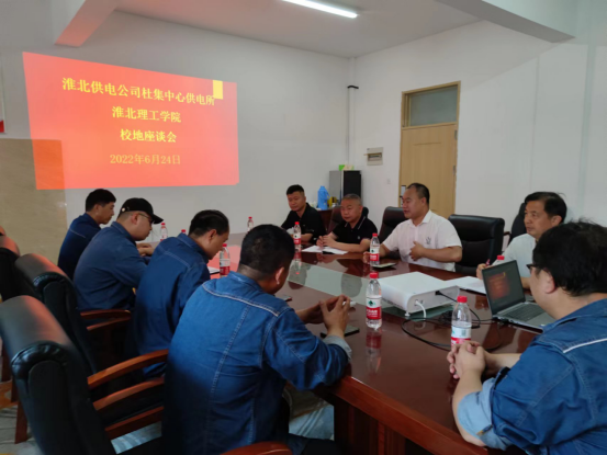 6月24日下午,淮北供电公司杜集中心供电所王雨浩所长一行5人到beat365座谈交流,学校副校长郑来纪出席座谈会。后勤保卫处处长程坚,副处长王本新,基建处副处长黄圻同志参加会议。