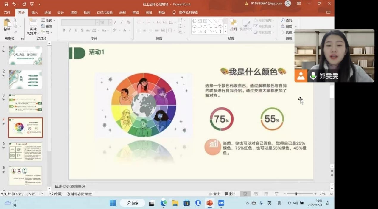郑雯雯以线上教学期间学生的压力状况和减压需求为主线,向同学们阐明本次团体活动的性质、目的和注意事项后,邀请大家线上一同签订合约书。通过“我是什么颜色”破冰小游戏,同学们由生疏局促变得跃跃欲试,沉浸在相识的喜悦中。紧接着进行“突破压力困境”小游戏,引导同学们认识压力、分享及讨论减压的有效策略并做出减缓压力的改善计划。