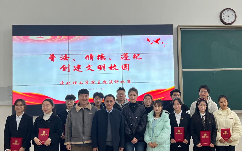 为全面贯彻党的教育方针,落实立德树人根本任务,坚持和落实“依法治校,以德治校”,进一步提升全校学生的法律意识、德育观念、遵纪观念,学校于12月9日上午,在一教121举行“普法、修德、遵纪,创建文明校园”主题演讲比赛。学生处处长孙增响出席本次活动,学生处(团委)刘帅克书记、张敬茹老师、各学院团总支负责人黄莹莹、候绪芳、员禹辛老师担任本次演讲比赛的评委。