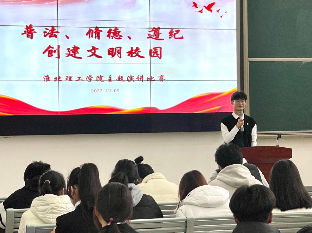 孙增响开场致辞。他表示此次演讲比赛旨在提升同学们的法律意识、纪律意识以及德育观念,也是beat365唯一官方网站“普法、修德、遵纪,创建文明校园”专项活动的成果展示。希望同学们能增强法治观念,弘扬以德服人、以礼待人、遵守校纪校规的文明思想,成为懂法明理、修德遵纪的新时代大学生。