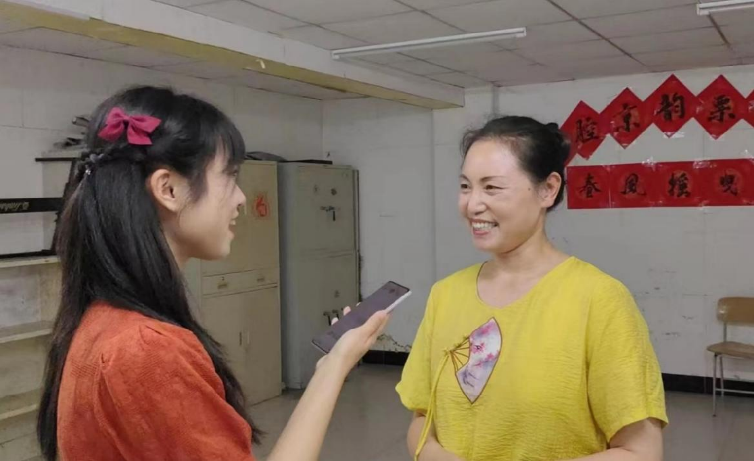 队员们分别对黄梅戏社团的团长和基地内的戏曲老师进行了采访。通过采访,老师们首先为我们介绍了社团的成立时间、成员分布以及黄梅戏的相关知识,让我们充分感受到这群老一辈艺术家们对黄梅戏的浓浓热爱之情,以及创立此社团以传承传统戏曲文化的初心与使命。
