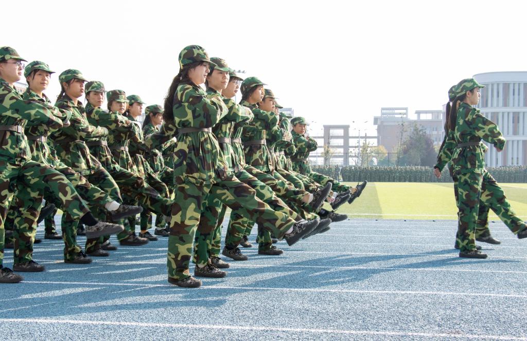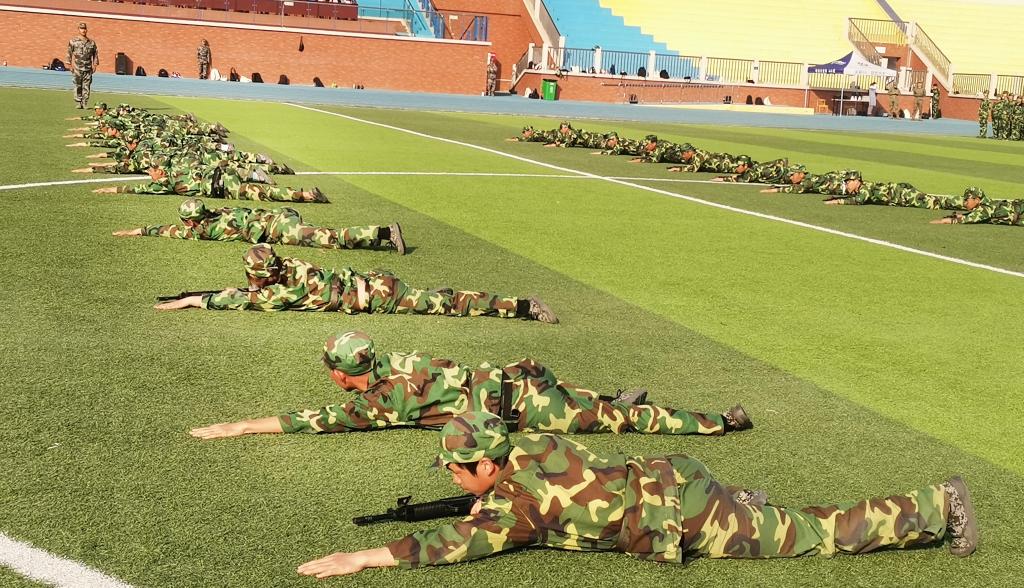 在嘹亮的军乐曲声中,身着迷彩服的2023新生正步进入会场,整齐的步伐、宏亮的口号、严整的军姿,展现了新生们饱满的精神状态。军训汇报表演现场,方阵变换展示中,同学们统一节奏听号令,各军训连队迈着青春的步伐,踏着时代的节拍整齐入场;他们训练有素一令一动、整齐划一,格斗术方阵的同学们英姿飒爽,肆意挥洒汗水;鼓点阵阵,军体拳方阵同学们踢、打、拿、拧,挺拔的身躯配合连贯的动作,一招一式,动作精炼,响亮的口号回荡在操场上空;伴随着激昂的音乐,他们挥匕果断,英气逼人,呐喊高昂,匕首出锋,利刃出鞘,一招一式,铿锵有力;震撼登场的还有匍匐操方阵,一招一式都是力量与速度的完美阐释,英姿飒飒,神采飞扬,为大家带来了一场精彩的热血沸腾的表演。