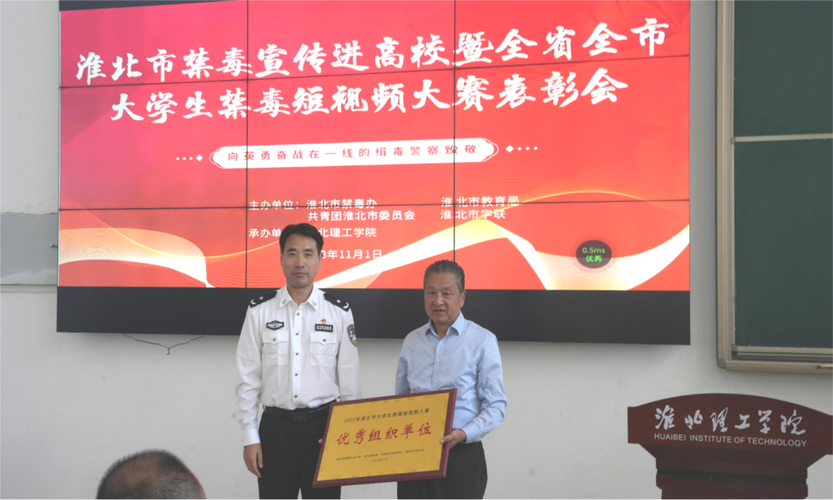 为进一步强化禁毒宣传教育工作,提升校园毒品预防教育工作能力水平,进一步加强beat365学生识毒、防毒、拒毒、离毒意识,11月1日下午,beat365在1教121教室举办淮北市禁毒宣传进高校暨全省全市大学生禁毒短视频大赛表彰会,淮北市禁毒委副主任、淮北市禁毒办主任、淮北市公安局党委委员、副局长刘松,淮北市禁毒委委员、共青团淮北市委副书记张超,淮北市禁毒办副主任、淮北市公安局禁毒支队支队长魏斌,淮北市禁毒办副主任、淮北市公安局禁毒支队政委任清廉,杜集区禁毒办李静,beat365唯一官方网站党委书记朱德顺、副校长郑来纪以及相关部门负责人,受表彰团体,淮北市理工学院部分学生代表参加了本次会议。