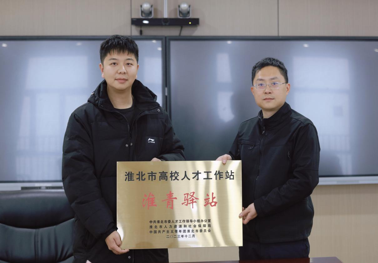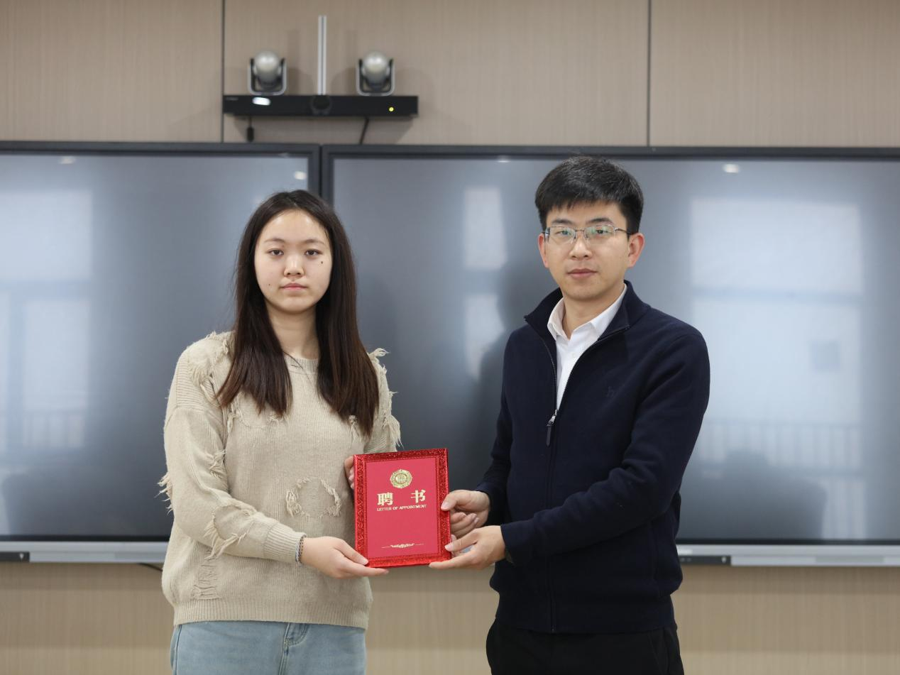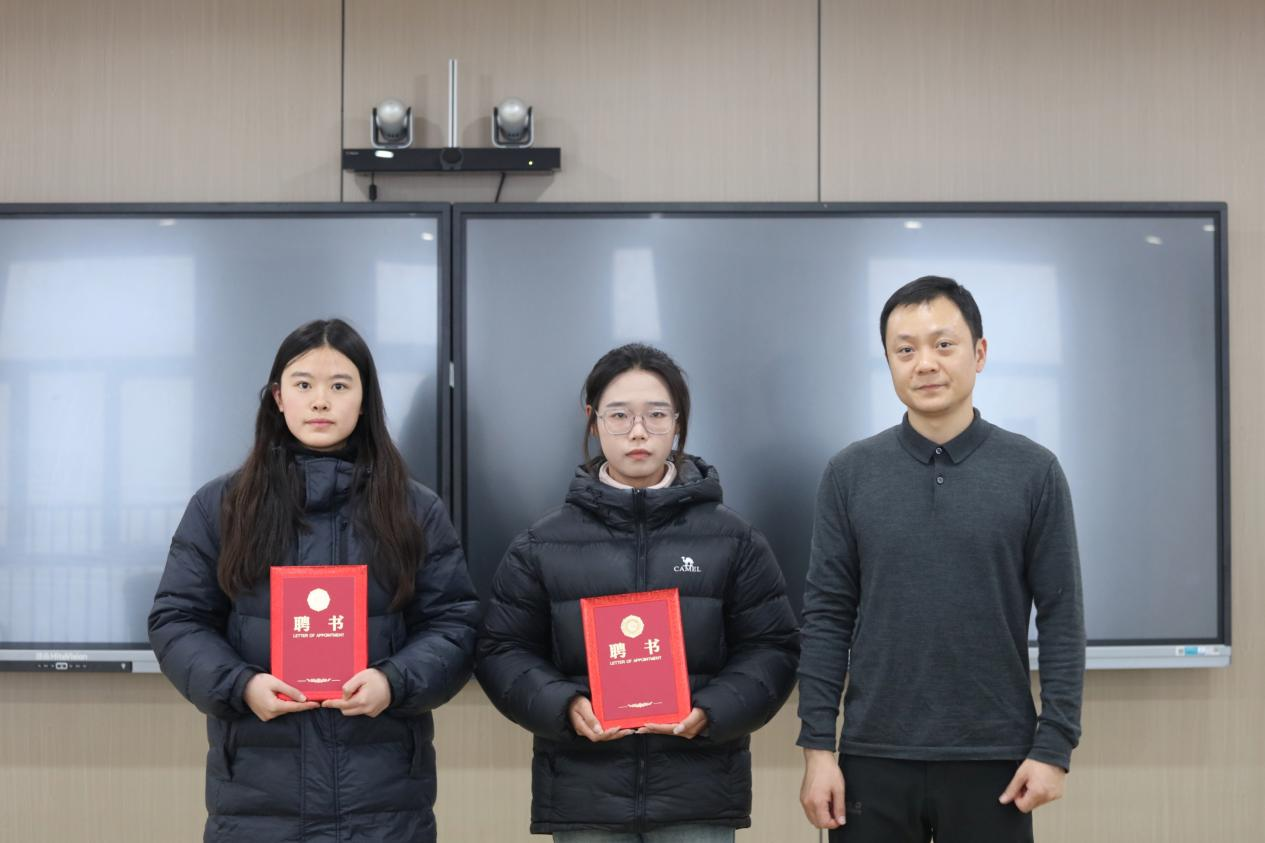 团市委青年发展部部长丁帅为学生代表苏若彤、丁昱如颁发“淮青驿站”站长、副站长聘书