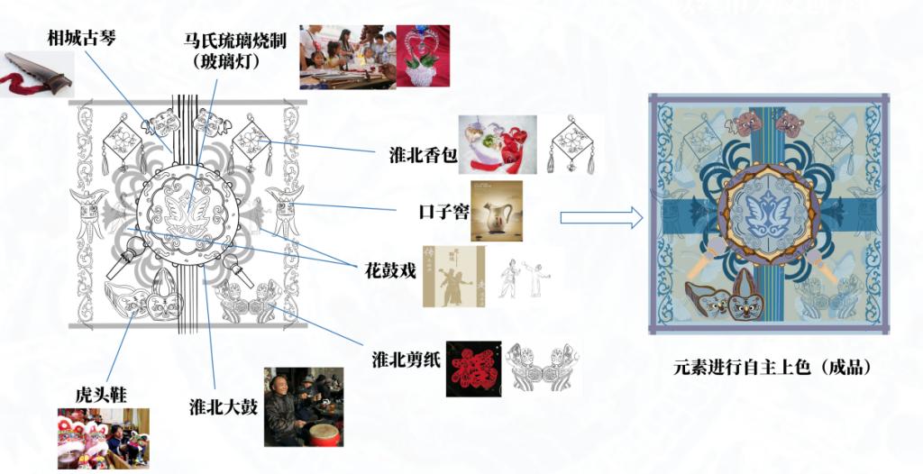 该项目团队深挖淮北市非遗文化资源,用现代创意设计巧妙将淮北市非物质文化遗产与丝巾相结合,项目产品融合淮北大鼓、相城古琴、马氏玻璃烧制、淮北香包、虎头鞋、淮北剪纸、花鼓戏、口子窖等8种淮北非遗文化元素,将其实物化、形象化展示在丝巾上,让非遗文化“走进”群众身边,同时又利用丝巾中的任一非遗元素衍生挂件、书签、折扇等周边文创产品,借助当下文创市场热度,拓展非遗受众群体,推动淮北市特色文化遗产“走出去”,提升当地群众认同感,增加非物质文化遗产曝光度。