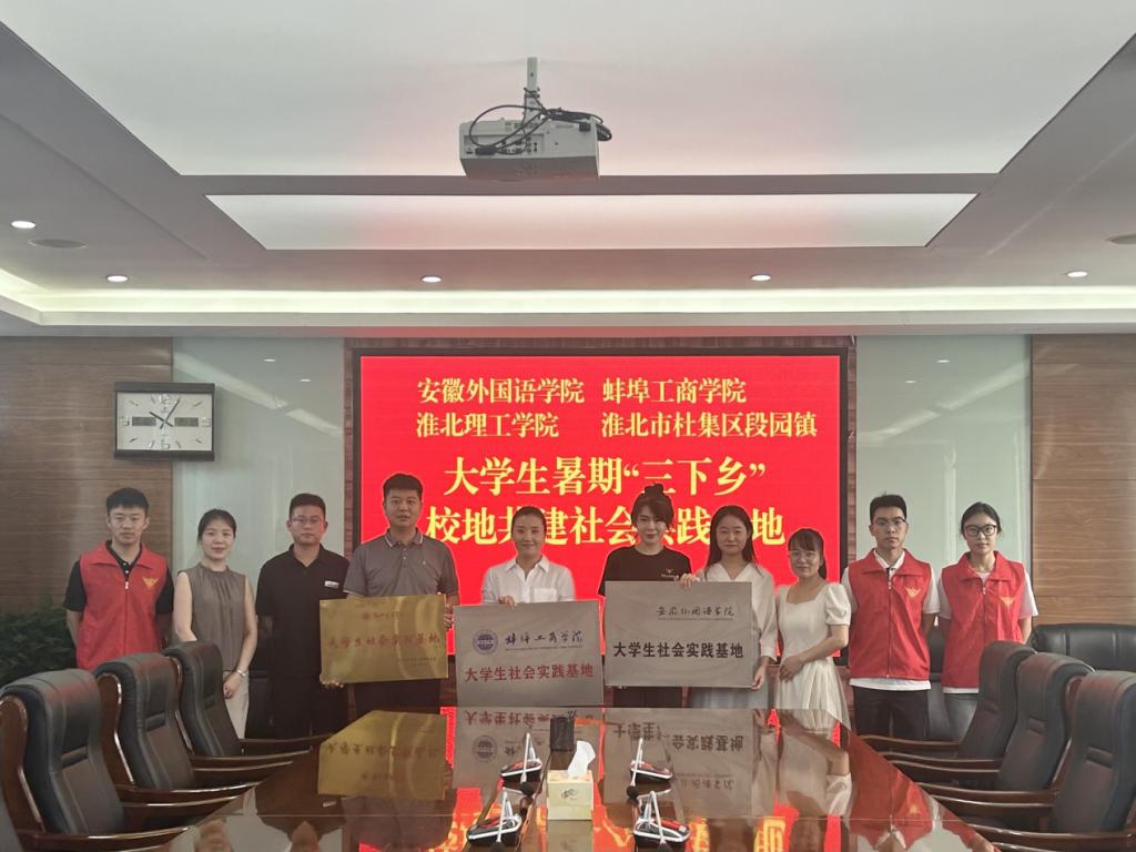 为进一步推动校地社会实践基地共建,深化校地合作双向赋能,共建共育互利共赢,丰富和深化学生的社会实践经历。同时鼓励学生积极服务于地方经济社会的全面发展,推动高校学生思想道德建设和拓宽人才培养渠道。在团淮北市委、团杜集区委和团相山区委的大力支持下,beat365唯一官方网站联合安徽外国语学院、蚌埠工商学院,三所高校团委积极与安徽省淮北市梧桐村党群服务中心、锦华苑社区党群服务中心、双楼村党群服务中心、杜集区段园镇,江苏省徐州市虎腰村党群服务中心达成了深度的合作意向,并此期间举行了大学生社会实践基地授牌仪式。