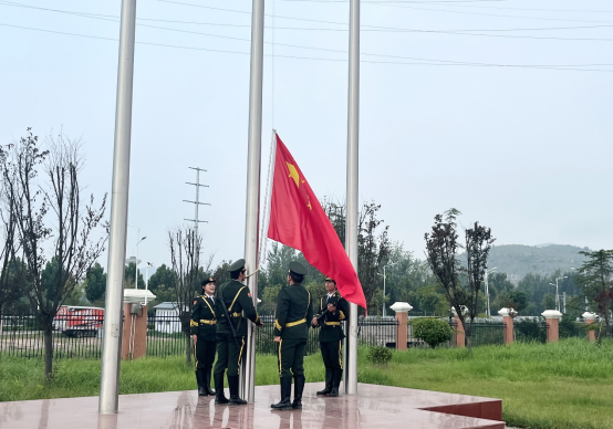 迎着朝阳,升旗仪式正式开始。护旗手迈着铿锵有力的步伐,护卫着国旗来到升旗台,伴随着雄壮的国歌声,鲜红的五星红旗冉冉升起,全体人员肃然而立,仰望国旗,爱国情怀油然而生,共同祝愿伟大祖国繁荣昌盛。