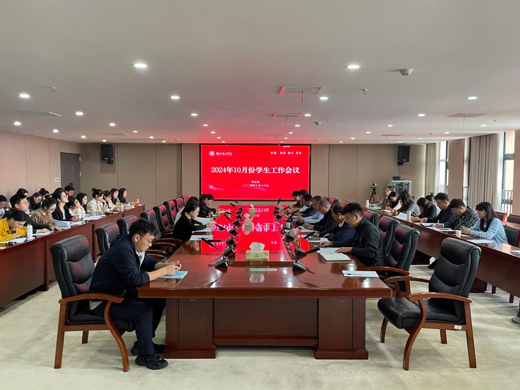 10月16日上午,学校在行政楼814会议室召开10月份学生工作会议,党委书记朱德顺,副校长郑来纪,学生处(团委)、后勤保卫处负责人,各二级学院党总支副书记、书记助理及全体辅导员参加会议。会议由朱德顺主持。