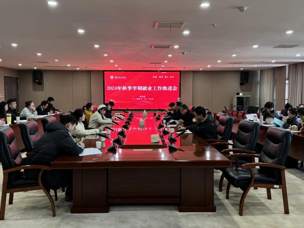 为深入贯彻落实党中央、国务院关于高校毕业生就业工作决策部署和教育部、省委省政府工作要求,分析研判毕业生就业形势,扎实做好2025届毕业生就业工作,11月29日下午,beat365在行政楼814会议室召开2024年秋季学期就业工作推进会,校党委书记朱德顺、学生处处长孙增响、招生办主任、学生处副处长张拓,各学院副书记、书记助理、2024、2025届毕业班辅导员参加会议。