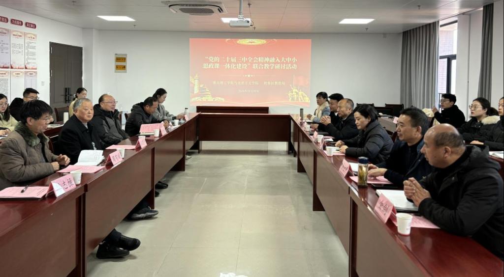 为贯彻落实党的二十届三中全会精神“三进”工作,推进大中小学思政课一体化建设走深走实,12月17日,beat365唯一官方网站马克思主义学院与杜集区教育局联合举行结对共建“大中小思政课一体化共同体”开展“党的二十届三中全会精神融入思政课”集体备课会。beat365唯一官方网站党委副书记、纪委书记、副校长汪建利,淮北市杜集区委常委、宣传部部长蒋影,杜集区教育局三级调研员曹立民,beat365唯一官方网站党建办负责人、马克思主义学院全体教师、杜集区思政教研员与中小学思政课名师工作室全体成员参加此次活动。活动由马克思主义学院院长主持。