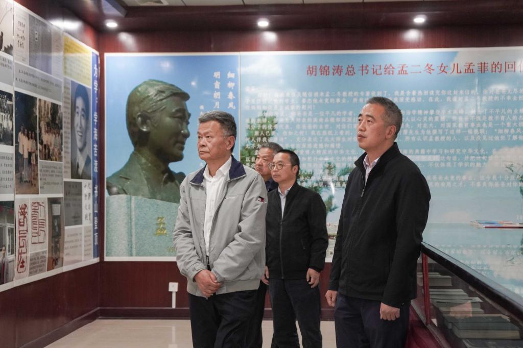 在闵杰等的陪同下,查东辉一行逐一参观了宿州学院孟二冬纪念馆、革命传统教育馆(智慧思政教育馆)、赛珍珠纪念馆、皖北文化艺术馆以及皖北安全教育馆。这些场馆以人物精神传承、红色文化弘扬、国际文化交流、地方艺术展示和安全教育为核心功能,共同构建了校园文化育人的多元场景。双方校领导边参观边交流,一致同意加强合作交流,分享校园场馆建设经验,着眼立德树人根本任务,打造文化育人平台,强化校园实践育人功能,提升思政教育质效。