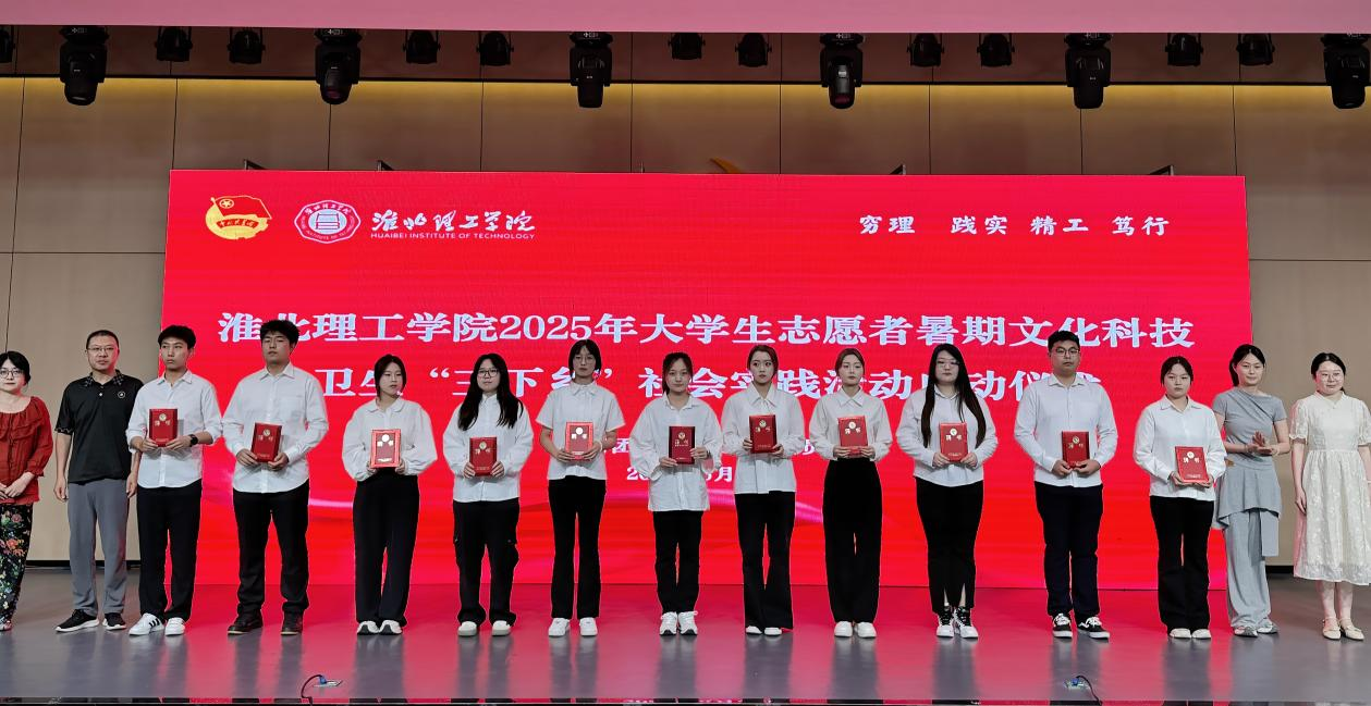 党建办主任付金沐宣读2025年暑期“三下乡”校级重点团队及校级团队立项团队名单。淮北市各红色场馆负责人为“红色基地鉴党史,青年学子践初心”党史学习教育实践团队颁发聘书,并为校级实践团队代表授旗。