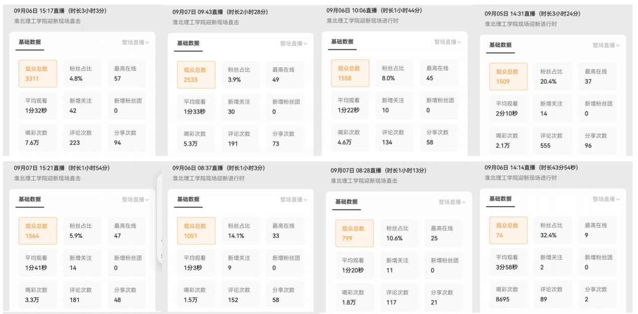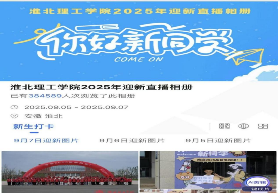 迎新直播期间,主播团队通过镜头带领新生“云逛校园”,详细介绍了教学楼、图书馆、食堂、宿舍等重点区域的分布及功能特点;针对新生报到的身份核验、材料提交、校园卡激活等关键环节进行演示,并实时回应弹幕区提出的各类疑问。图文直播板块则同步推送迎新图片,无论是志愿者热情引导的身影、新生与家长满脸的期待,还是校园里醒目的迎新指引,都一一呈现,让“云迎新”更具画面感。据统计,图文直播截止9月7日下午5点30分,上传照片近4000张,总浏览量超过37万人次;举办迎新直播八场,进入直播间人数总计14202人,直播间点赞次数总计31.1万次。