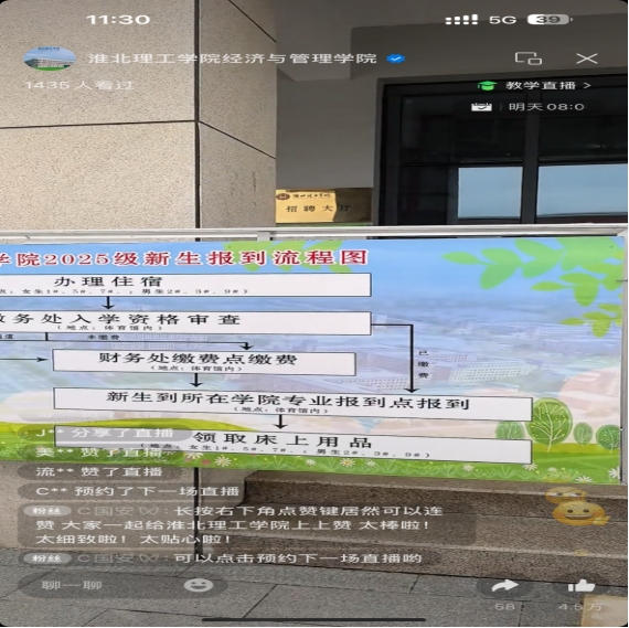 为确保直播活动顺利开展,经济与管理学院成立了直播迎新工作小组,小组围绕“信息精准传递、服务高效对接”核心目标,先后多次召开协调会,细化直播流程、打磨内容脚本、测试技术设备,从报到流程拆解、校园设施导览、入学材料准备到生活注意事项等新生及家长关切的问题进行全面梳理,形成了涵盖“政策解读+实景展示+互动答疑”的立体化直播内容体系。