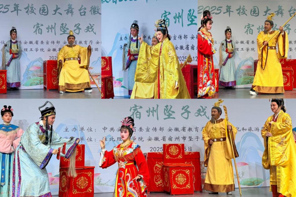 演出现场,宿州市坠子剧团倾情献演了国家非物质文化遗产保护项目——宿州坠子戏。剧团呈现了两台经典坠子戏剧目:《赶考》与《公主求情》。《赶考》一剧讲述了少年包拯的成长传奇:幼年失恃,又遭二嫂陷害而被弃,幸赖长嫂抚育成人,十二岁进京赴考取得功名,返乡后巧断家事,宽厚不计前嫌。《公主求情》则以唐代大安宫为故事背景,讲述长乐公主因皇后削减其出嫁妆奁而心生不满,遂向太上皇请求斡旋的故事。该剧旨在倡导革除奢靡旧习、杜绝铺张浪费。艺术家们卓越的唱功、非凡的表演诠释了中国传统戏曲艺术的无穷魅力,给师生带来了一场视觉盛宴;整场演出精彩纷呈,艺术家们精湛娴熟的技艺感染了全场师生,现场掌声经久不息。