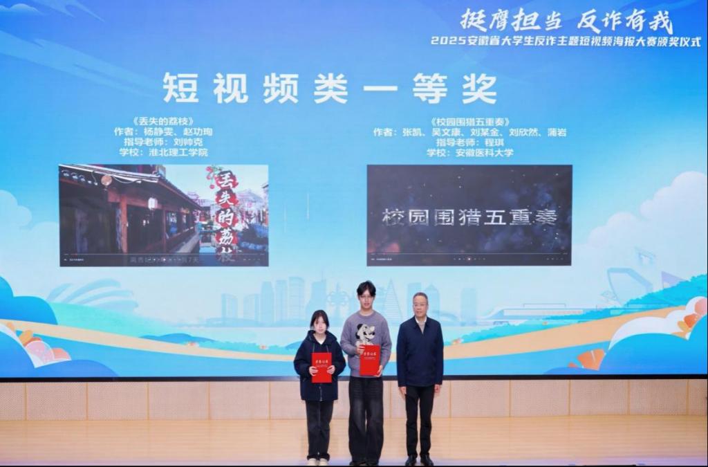 1月9日,由安徽省通信管理局、安徽省公安厅、安徽省教育厅、共青团安徽省委员会、安徽省学生联合会共同主办的“2025年安徽省大学生反诈主题短视频海报大赛”颁奖仪式在合肥市举行。