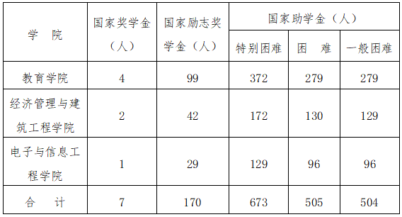 省教育厅、财政厅2023年下达beat365名额:国家奖学金7人,国家励志奖学金170人、国家助学金1682人,各学院分配名额如下: