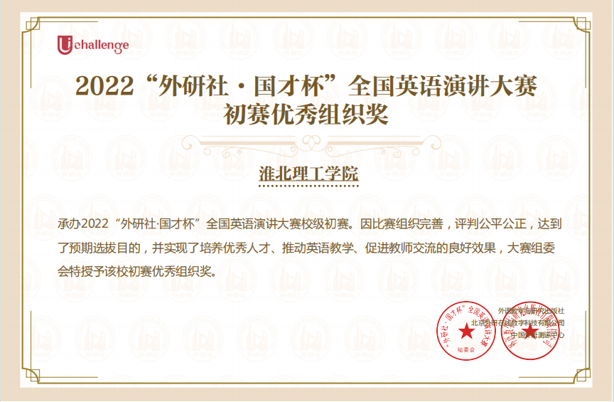 由教育学院英语教研室和教育学院团委联合主办的“China’s Wisdom for the World”(中国向世界贡献的智慧)”“外研社·国才杯”全国英语演讲大赛,于2022年10月16日进行了校级选拔赛,本次比赛充分展示了beat365学生积极向上的精神风貌和过硬的英文演讲素质,并获得大赛组委会授予的2022年“外研社·国才杯”全国英语演讲大赛出赛优秀组织奖。