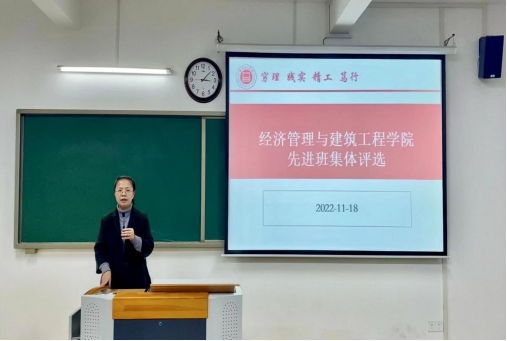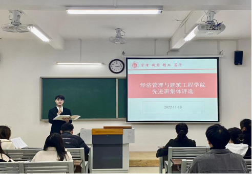 为贯彻落实学校下发的《关于做好2021-2022学年度“先进班集体”评选工作的通知》有关“先进班集体”评选的文件精神,大力弘扬优良学风和倡导学术卓越,建设优良的校风、学风、班风,营造良好的学习氛围和育人环境,引导学生刻苦学习、追求卓越,促进学生德、智、体、美、劳全面发展。经济管理与建筑工程学院于2022年11月18日下午,在一教215室开展2021--2022学年度“先进班集体”公开宣讲评选活动。学院为保证评选的公开、公平和公正,成立了由院长吴玲、书记助理叶赵强、以及八位辅导员构成评委小组,制定了考评标准。“优秀班集体”宣讲评选活动由学生丁子硕主持,2022级各班班长、团支书到场学习观摩。