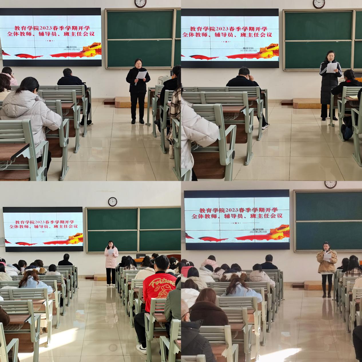 新学期新起点,为做好新学期教学、学生管理等各项工作,教育学院于2月19日下午在1教121教室召开全体教师、辅导员、班主任大会。此次会议旨在总结上学期的各项工作,并对新学期的工作提出展望与期待。