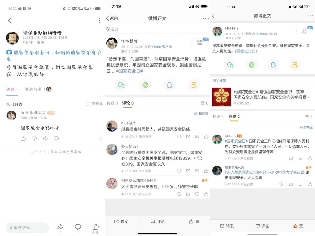 4月15日至4月22日,学院创新宣传方式,组织学生利用微信、微博等平台发布原创短视频和宣传标语参与“国家安全”话题接力和互动,进行宣传教育。