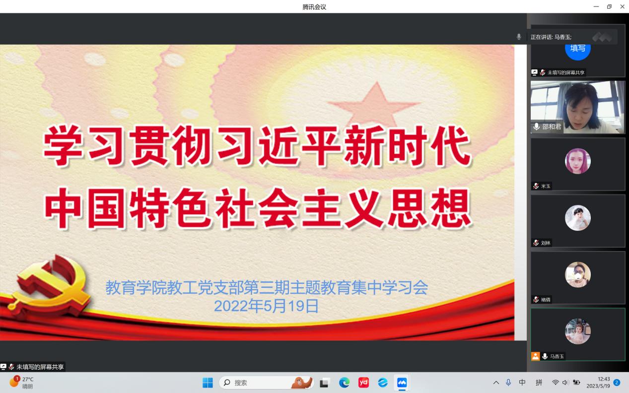 5月19日下午,教育学院学习贯彻习近平新时代中国特色社会主义思想主题教育开展第三期读书班党课学习,本次学习会以“线上课堂”形式举行,由教工党支部委员邵和君同志主持并领学。