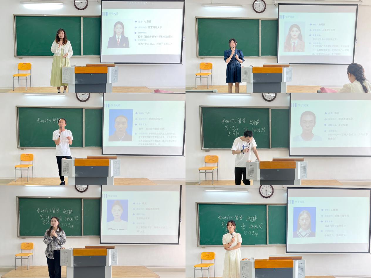交流会开始,黄莹莹老师向成功上岸的6名学生表示祝贺,随后她向同学们介绍了23届毕业生的考研情况,鼓励同学们向榜样看齐,珍惜时间,以积极心态面对挑战。会上,上岸成功的6名学生开始传授考研经验,针对各专业的考试科目、参考书目等作出具体解说,并结合自己的切身经历讲述了考研所要经历的问题,为立志考研的同学们指引方向、提供宝贵经验。