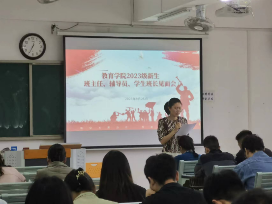 为帮助2023级新生尽快适应在校园学习与生活环境,进一步加强学生思想政治教育,提升学生班级管理水平,教育学院于9月25日中午,在1号教学楼521室举行“2023级班主任、辅导员和班长见面会”。学院分管副书记孟向红、书记助理黄莹莹、团总支副书记许海涛、辅导员郭鸿鑫老师到达见面会现场进行指导工作。孟向红主持见面会。