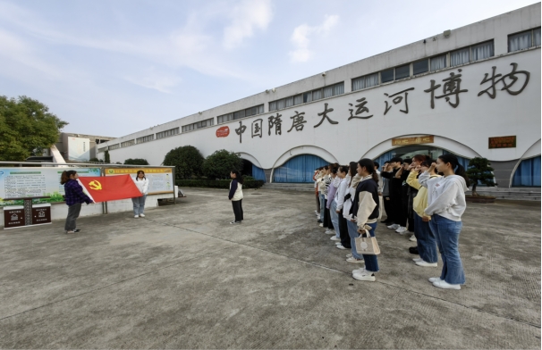 全体党员师生在隋唐大运河博物馆广场前,面对鲜红的党旗,举起自己的右手重温入党誓词,进一步坚定作为一名共产党员的责任感和使命感,不忘入党初心,激励党员同学对照党章和党员标准,更好地在班级学习生活中发挥模范带头作用,以更加饱满的热情永葆共产党的政治本色。