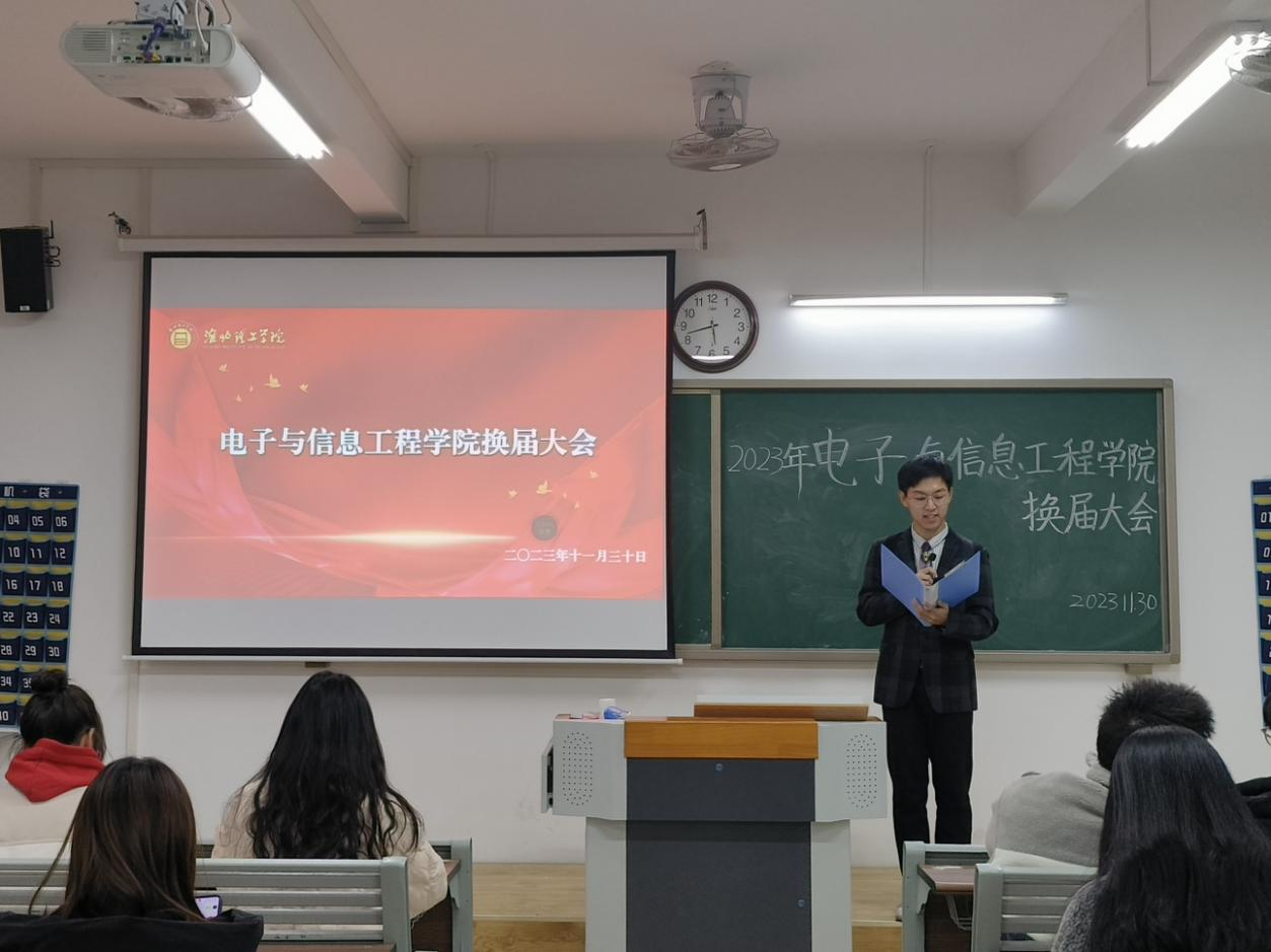 11月29日,电子与信息工程学院学生会换届大会在第一教学楼405教室举行。电信学院学生会主席梅毅松、副主席朱昊、副主席陈可怡、新主席徐娜娜同学以及学生会新老干部出席本次会议。本次换届大会的主持人是宇文昕羽。