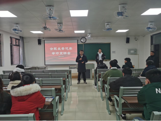 随后,合肥长安汽车人力资源处张虎围绕长安汽车究竟做什么、长安汽车能给你什么、长安汽车的福利待遇等方面为现场同学进行了详细介绍,并对同学们加入合肥长安汽车公司表示了期待。