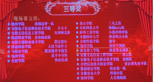 12月11日,安徽省教育厅主办、安徽财经大学承办的2023年安徽省大学生服务外包创新创业大赛在安徽财经大学胜利落幕,由经济与管理学院兰露老师指导的潘云、林新乐等五位同学组成的“跟着党走就队”团队荣获省级三等奖。