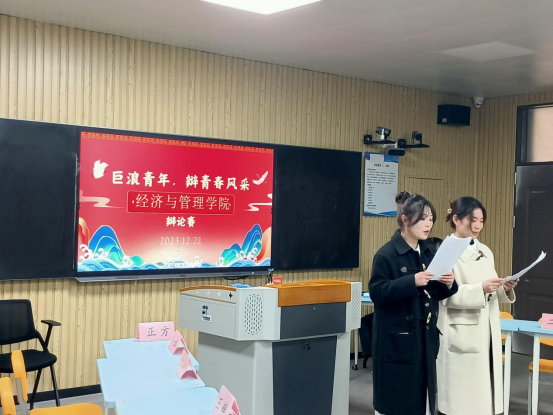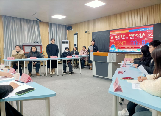 为进一步丰富校园文化生活,加强大学生思想引领,引导广大青年树立正确的世界观、人生观、价值观,培养青年学生的团队合作精神,进一步提高学生综合素质,彰显校园文化新活力,展现青年学生昂扬向上的青春风采和精神风貌,12月22日,经济与管理学院组织开展了以“巨浪青年·辩青春风采”为主题的辩论赛活动。本次活动由23级经济学专升本1班承办,学院18支队伍70余人参加本次比赛。
