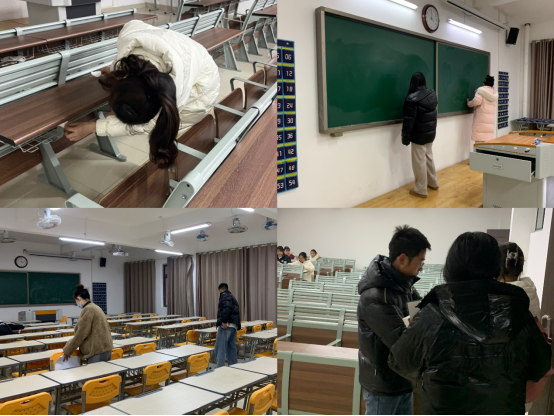 检查完学生寝室后,辅导员老师们又到教学楼,对我院责任教室卫生区域进行检查。大家认真检查了包括教室的地面、黑板、窗户等区域的卫生情况。同时,还认真查看了教室的消毒和通风情况,以确保空气质量良好。