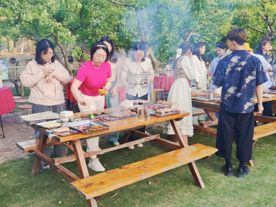 晚餐时间,大家围坐在餐桌前一起动手制作烧烤,享受露天烧烤带来的小确幸。饭后,学院英语教研室陈博识老师倾情献唱,用一场轻松欢快的草坪音乐将本次踏青活动推向高潮。