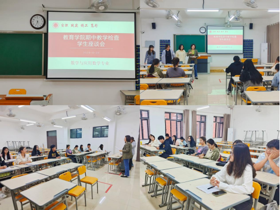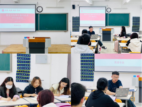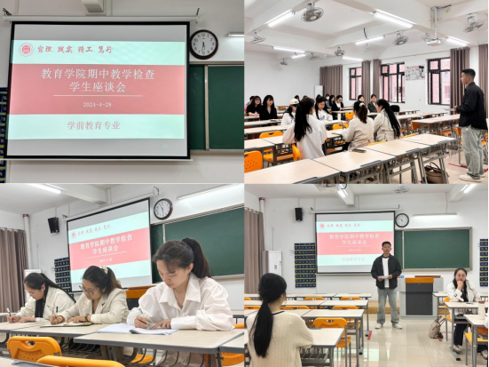 为全面掌握教学运行情况,切实保障教育教学工作质量,进一步加强师生间的沟通交流。教育学院于4月28日晚在2号教学楼306、307、308、309教室分专业召开期中教学检查师生座谈会,数学与应用数学、英语、汉语言文学、学前教育等四个专业的教研室主任、教师代表、学生代表参加了座谈会。会议分别由学院书记助理黄莹莹、辅导员彭慧敏、高伟和张颖颖主持。