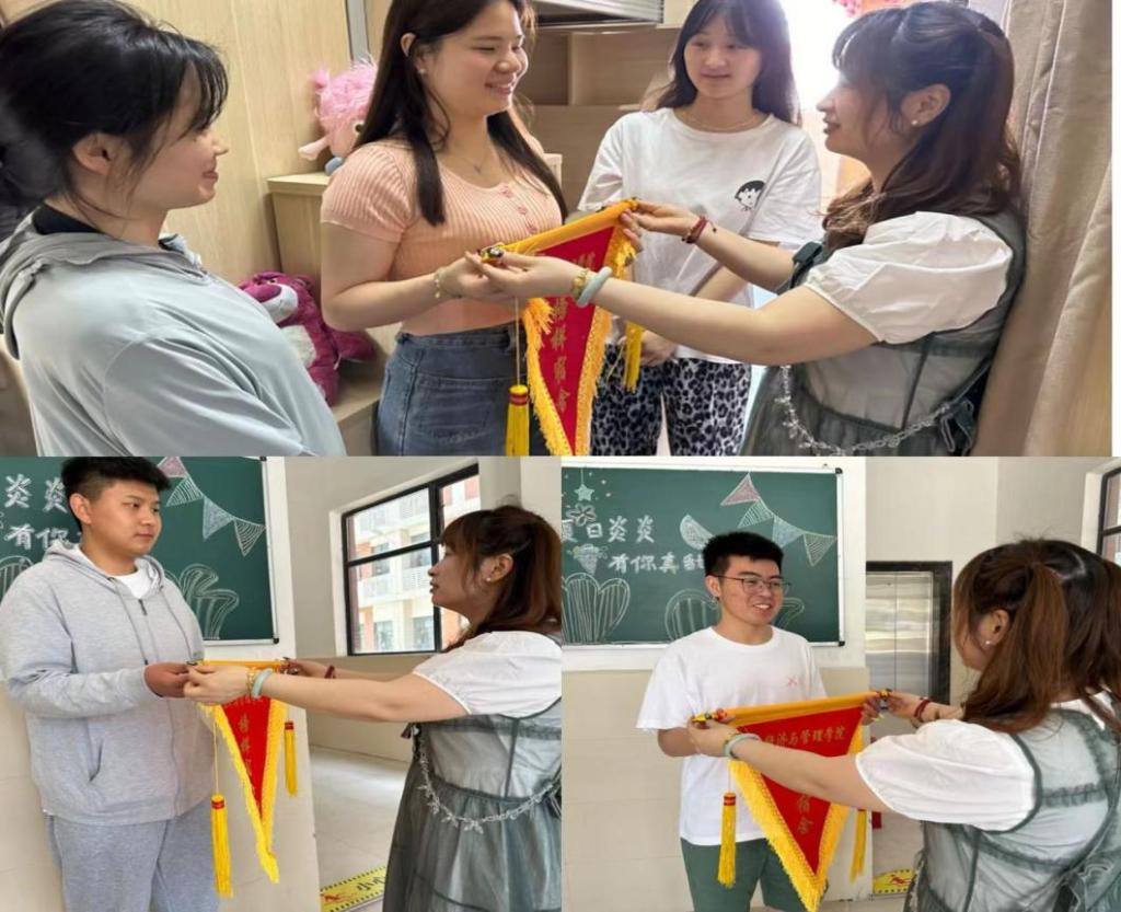 辅导员三进学生宿舍,查看各班级宿舍网格化管理模式的运行效果,并由我院团支部副书记为各“榜样宿舍”颁发锦旗,鼓励同学们更加主动的参与到宿舍管理中。