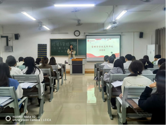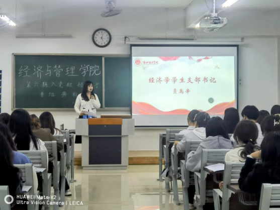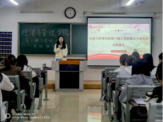 管理学学生支部书记石圆圆强调学员们不仅要争取在组织上入党,更应做到在思想上入党,要在思想上不断端正入党动机,加强对政治理论知识的学习,提高党性修养;在学习上严格要求自己,注重提高专业能力及素质;在实践中践行全心全意为人民服务的宗旨,从身边点滴做起,争做模范先锋;学员间应加强交流与学习,以促进共同进步;希望学员们能够以满腔热情和积极态度参与培训,珍惜时光,不负时代,为实现中华民族伟大复兴的中国梦贡献己力。