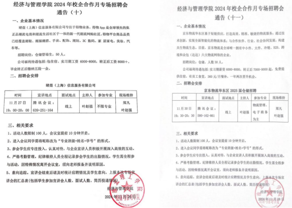 为进一步落实学院每周开展两家企业宣讲的就业工作部署,学院于第十三周11月26日、29日成功举办了睹煜(上海)信息服务有限公司与京东物流华东区专场招聘会。此次活动以腾讯会议为平台,学院2025届毕业生积极参与。