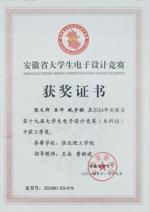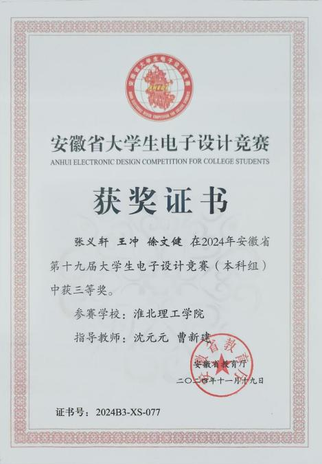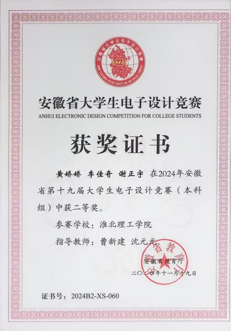 大学生电子设计竞赛题型多样,涵盖电源、信号源、高频无线电、放大器、仪器仪表、数据采集与处理、控制等类别。兼具理论设计与实践制作,在曹新建老师及其他专业教师的悉心指导下,参赛队伍历经数月的精心筹备与刻苦钻研,进行了全面而深入的赛前准备。从理论知识的巩固到实践技能的锤炼,每一步都凝聚着师生们的智慧与汗水,确保了参赛队伍以最佳状态迎接安徽省大学生电子设计大赛的挑战,最后有4支队伍在此次比赛中取得了优异成绩。