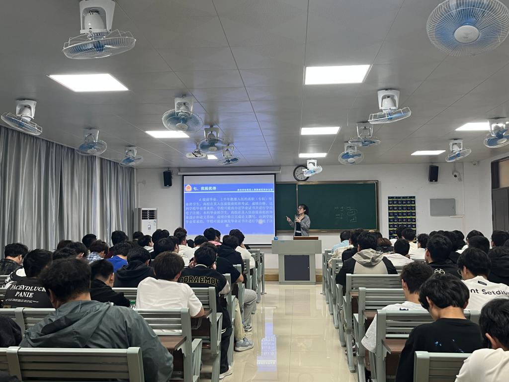 随后,学校负责征兵工作站的邵琦皎老师重点解读了大学生征兵入伍优抚优待政策。邵琦皎老师详细介绍了从入伍补贴、学费补偿到升学优惠、就业安置等一系列政策。她强调,国家高度重视大学生入伍,出台这些政策旨在鼓励更多高素质人才投身军队建设,为大学生提供广阔的发展空间。对于同学们提出的关于政策细节的疑问,邵琦皎老师都一一耐心解答,让同学们对入伍后的权益保障有了清晰的认识。