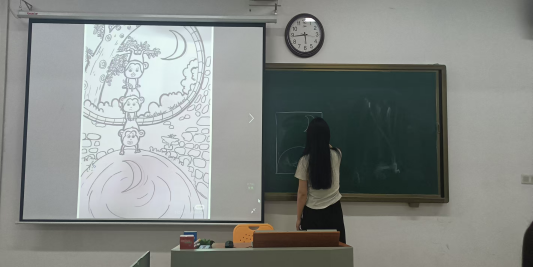 同学们以“你画我猜”的游戏形式,将传统文化符号表达为幼儿易于识别和理解的有趣图画,同学们用彩色粉笔在黑板上绘制“年兽故事”“孔融让梨”等文化主题简笔画,通过童趣视角解读画面内涵,苏可可、樊悦悦同学画的‘猴子水中捞月亮’,不仅能直观地让孩子们猜到故事,更引导了小朋友们懂得观察与思考。“你画我猜”玩转了文化符号,游戏既考验文化理解力,更能锻炼幼师必备的简笔画与叙事能力,活动现场欢笑声中碰撞出“传统文化儿童化”的多元创意。