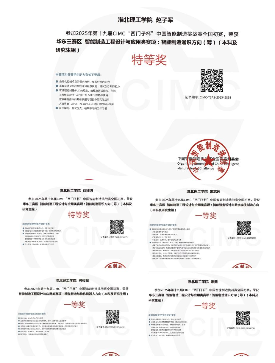 2025年7月14日至18日,由教育部高等学校自动化类专业教学指导委员会、西门子(中国)有限公司和中国仿真学会联合主办的2025年第十九届CIMC“西门子杯”中国智能制造挑战赛全国初赛在全国多赛区同步开赛,我院选派18支队伍分赴马鞍山、芜湖赛区参赛,共获特等奖2项,一等奖3项,二等奖9项,三等奖3项,创历史最佳战绩!