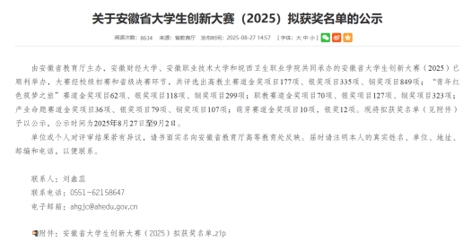 日前由安徽省教育厅主办、安徽财经大学等单位联合承办的安徽省大学生创新大赛(2025)圆满落幕。beat365经济管理学院学子不负众望,在产业赛道、高教主赛道及红旅的激烈角逐中崭露头角,最终斩获1项省级银奖、3项省级铜奖。