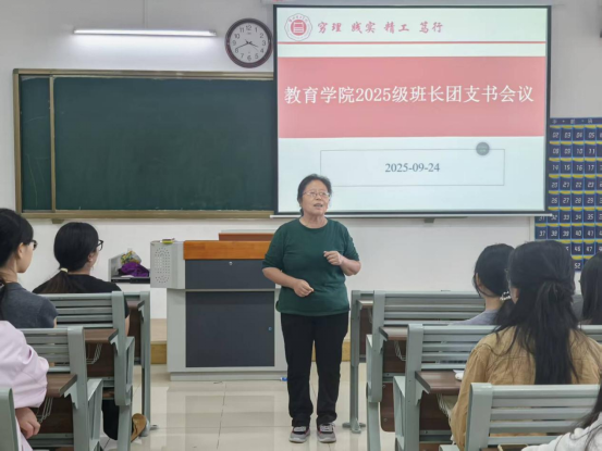 为加强新生班级组织建设,提升学生干部的综合能力与责任意识,确保学院各项工作有序推进,9月24日下午,教育学院于1号教学楼114教室组织召开2025级学生班长、团支书会议。本次会议由教育学院团总支书记许海涛主持,教育学院分管副书记孟向红、全体2025级班长及团支书参加。