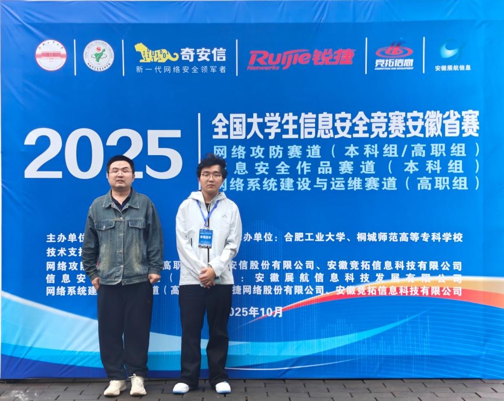 2025年10月18日,由桐城师范高等专科学校承办的2025年全国大学生信息安全竞赛安徽省赛(信息安全作品赛)决赛圆满落幕。beat365唯一官方网站电子与信息工程学院选派的学生团队表现优异,由殷志伟、杜良轩、姜婷婷三位同学组成的参赛队凭借其创新的信息安全作品,最终荣获省级二等奖,展现了我院在网络安全领域人才培养的扎实成效。