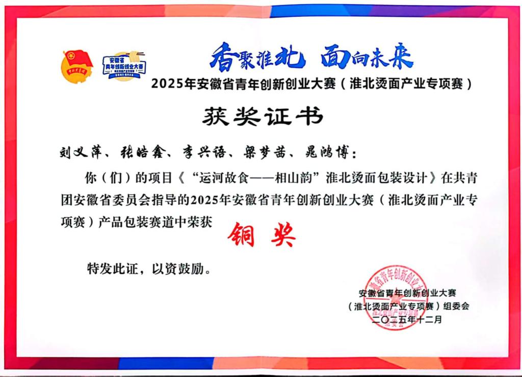 由刘义萍同学主持的铜奖项目《“运河故食——相山韵”淮北烫面包装设计》,瞄准产品包装赛道,以淮北运河文化、相山地域元素为灵感,将烫面包装设计为兼具文化辨识度与实用性的创意载体,既提升了产品的视觉吸引力,也通过包装传递了地方文化符号,助力烫面产品的品牌化传播。